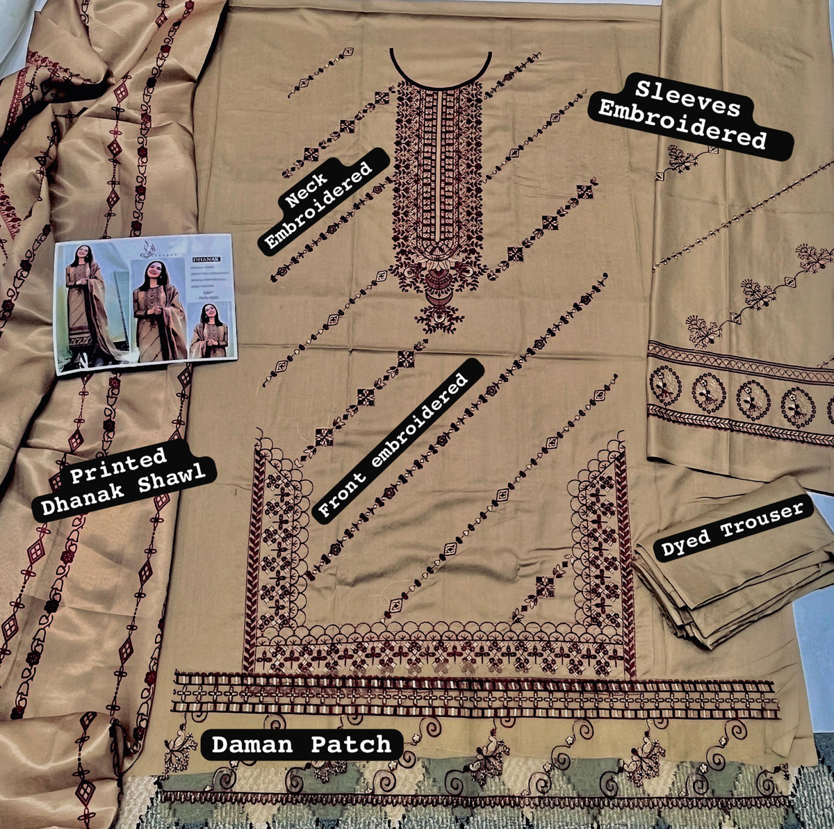 3PC IN DHANAK FABRIC* Front Full Embroidered * Daman Embroidered* Sleeves Embroidered* Trouser & Back DyedDIGITAL PRINTED DHANAK SHAWL
